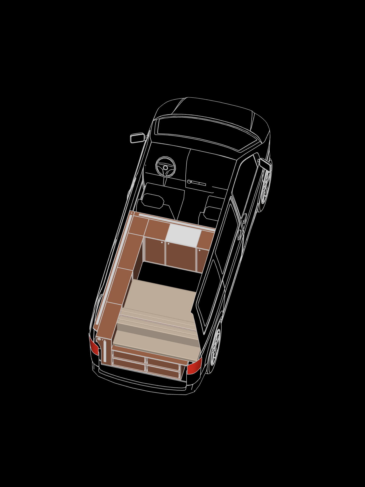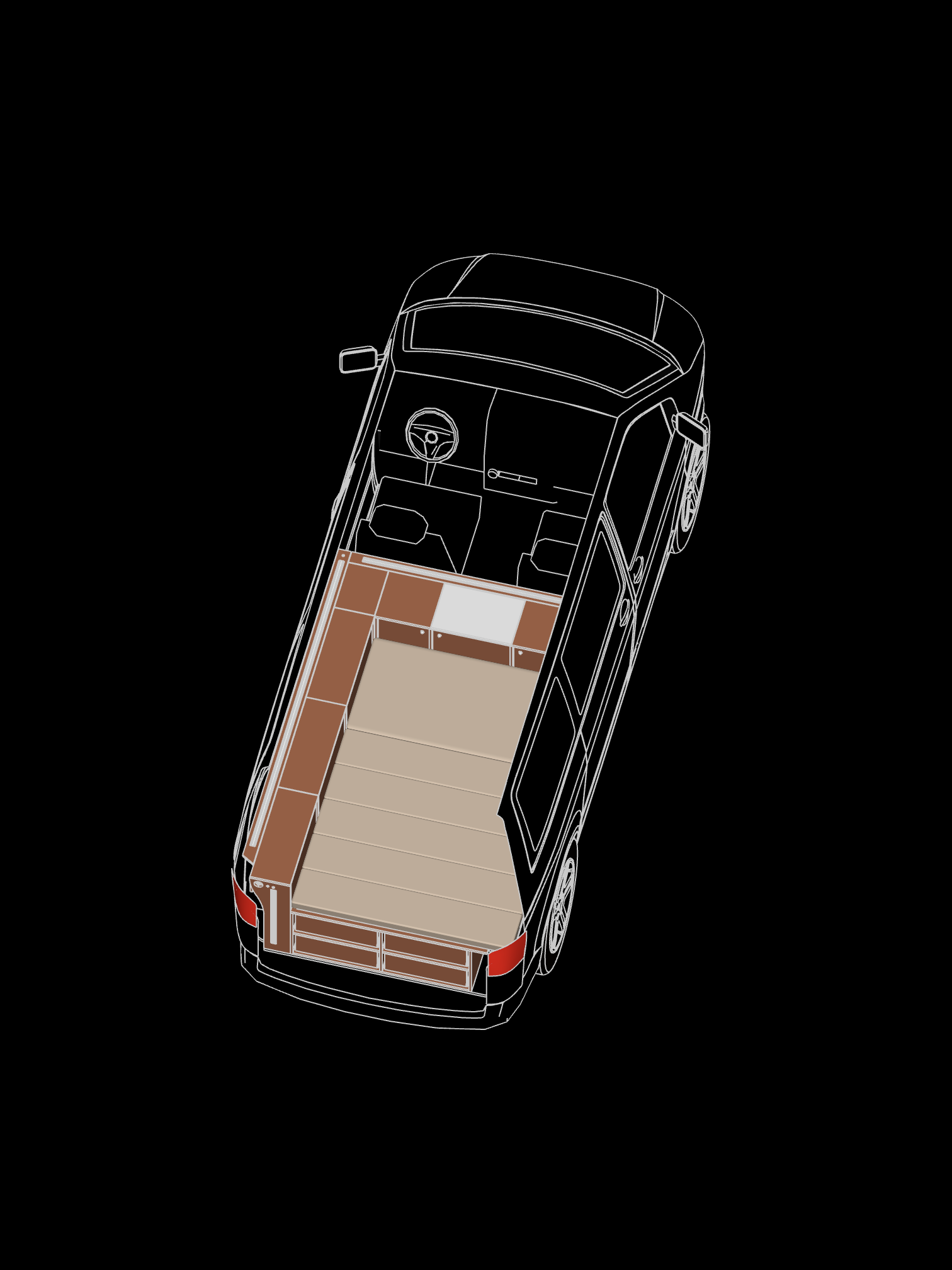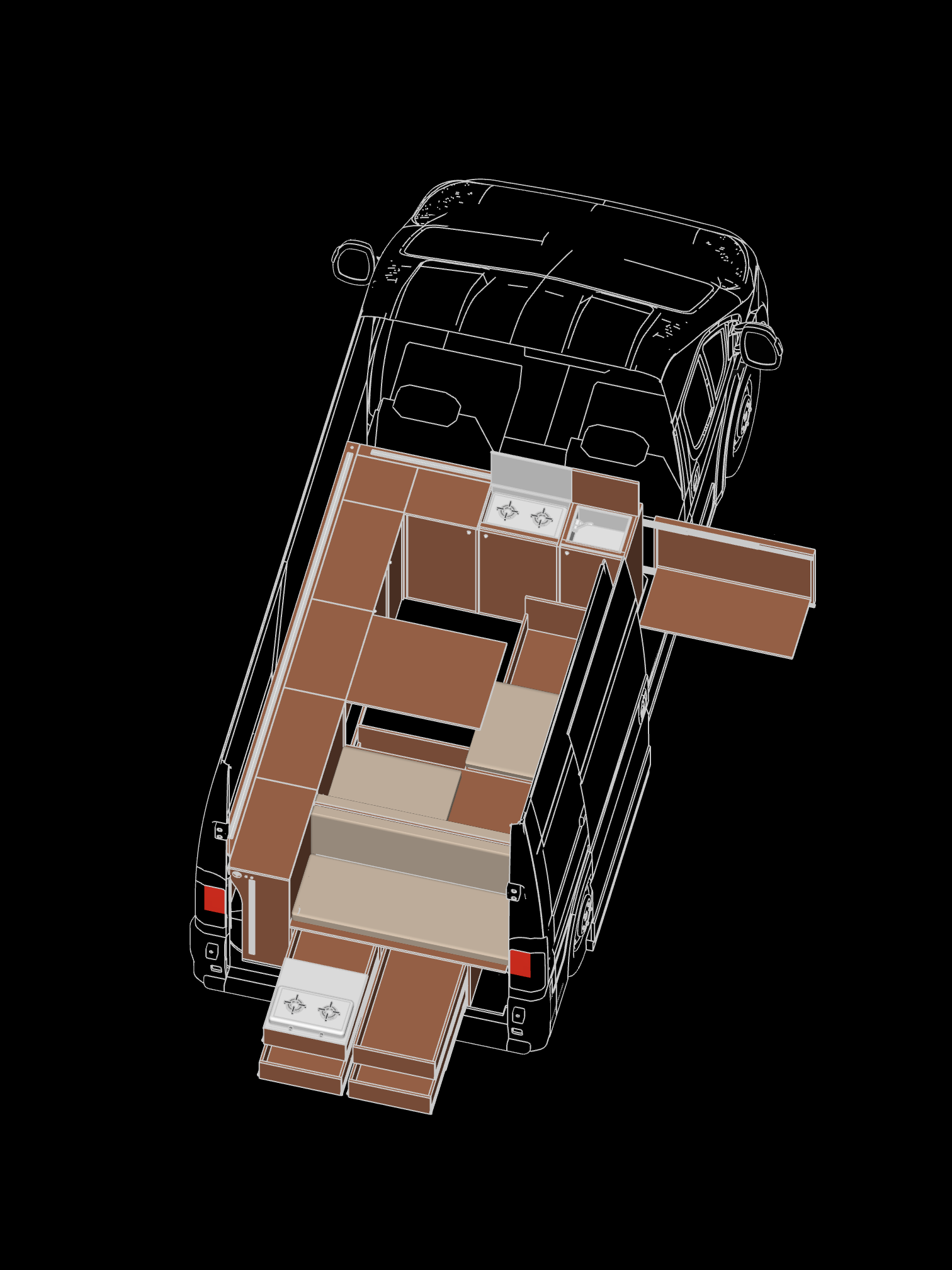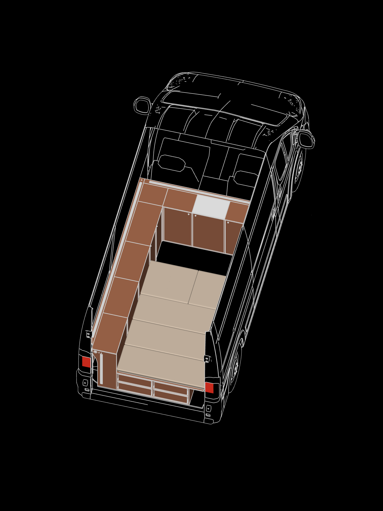 Les meubles reposent sur une base stable et linéaire. Pour cela, le plancher est adapté à la configuration du véhicule et fixé aux points d’ancrage d’origine. Le bois est protégé d’une huile teintée ou recouvert d’une enveloppe en pvc. Le plancher peut être isolé et reste amovible.