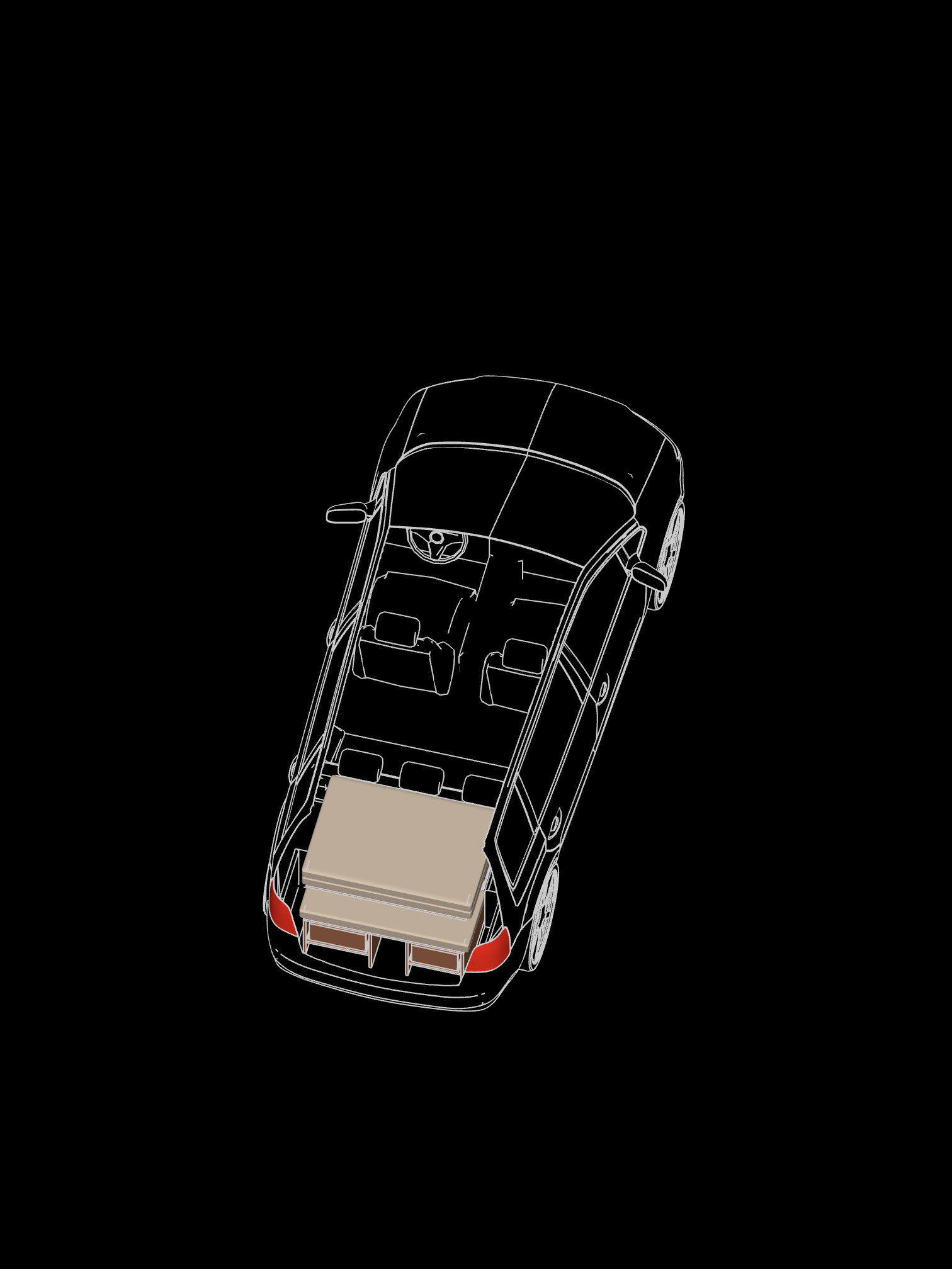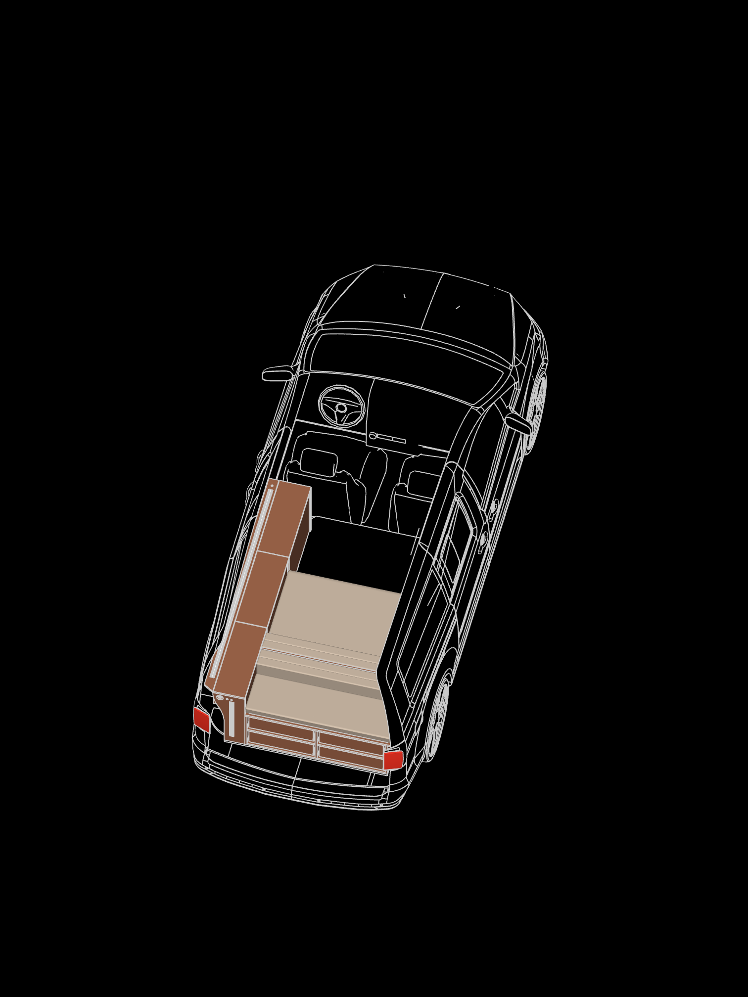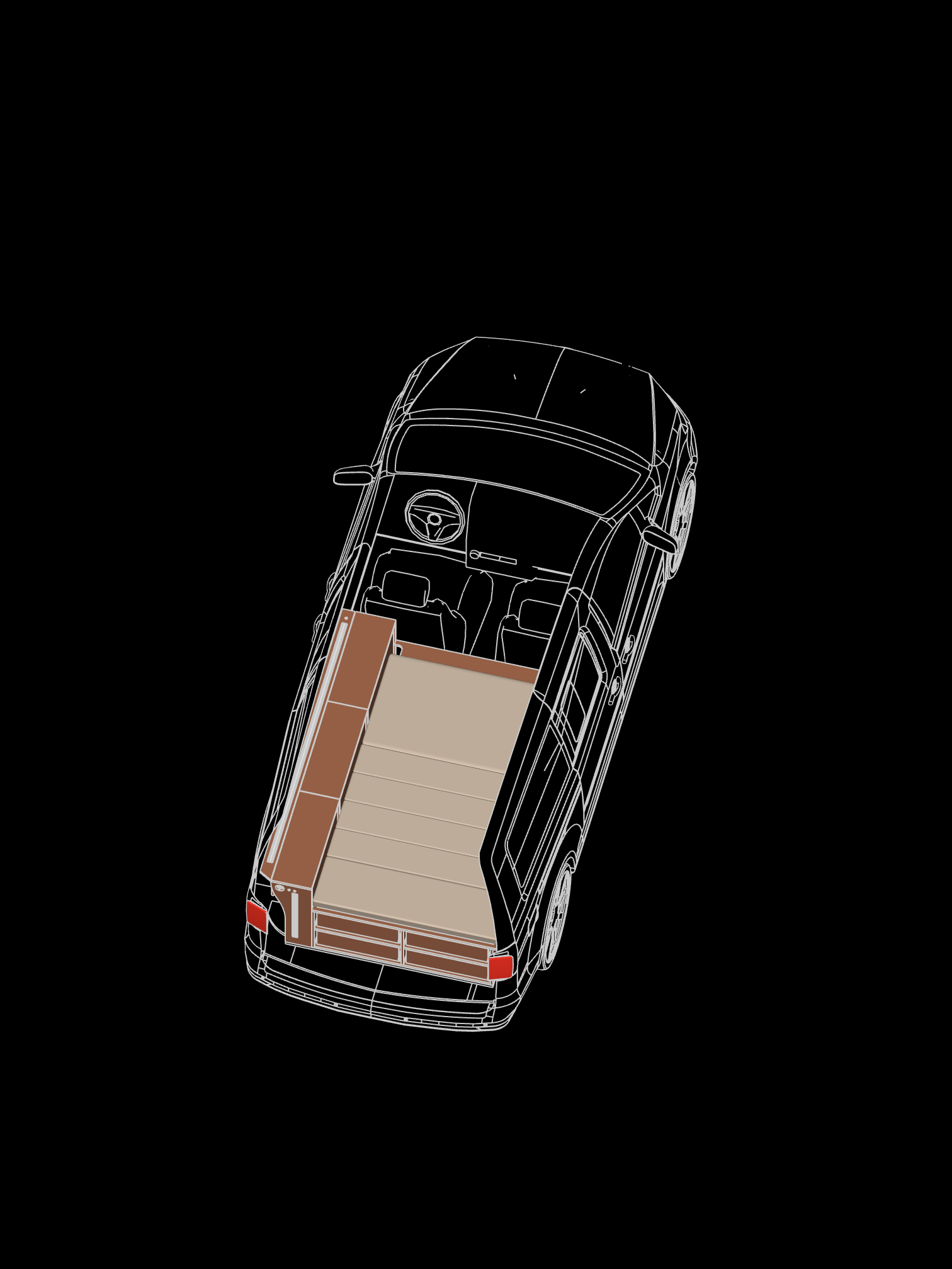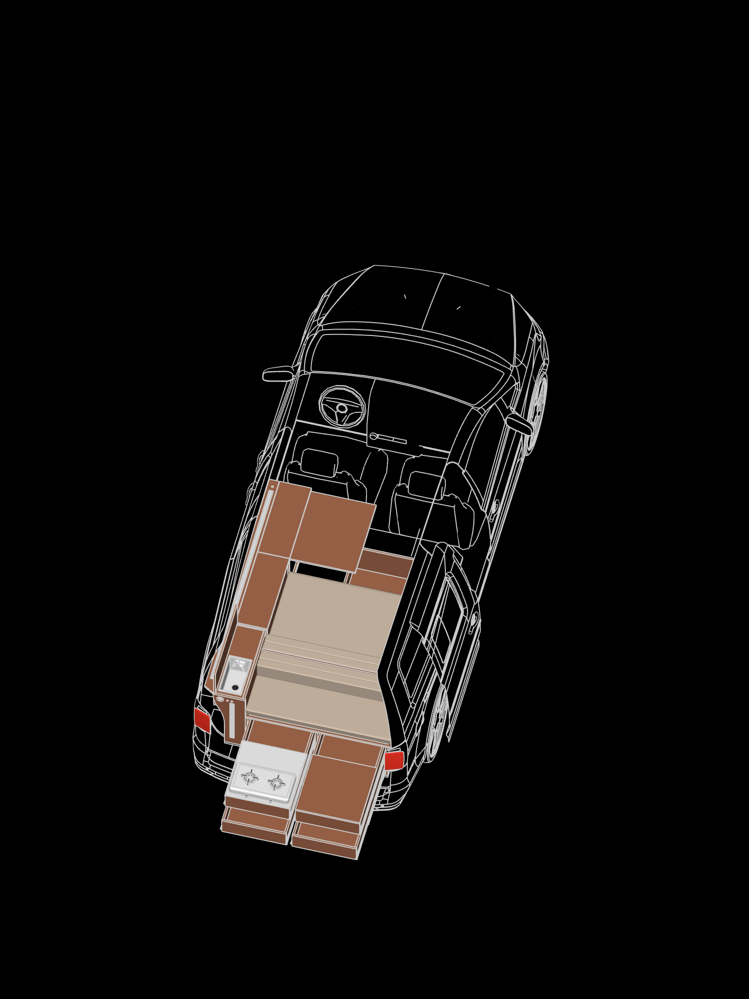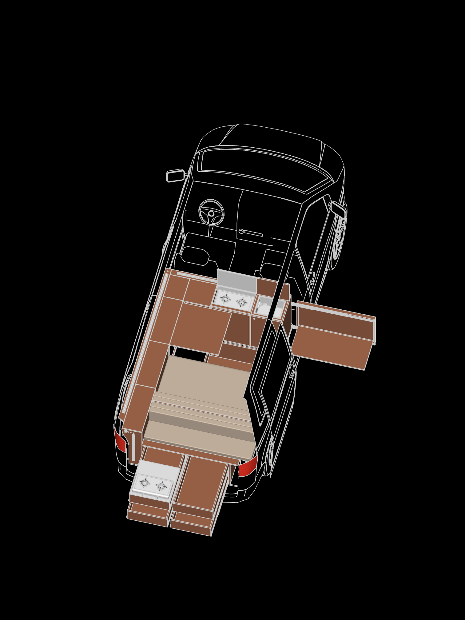 Les meubles reposent sur une base stable et linéaire. Pour cela, le plancher est adapté à la configuration du véhicule et fixé aux points d’ancrage d’origine. Le bois est protégé d’une huile teintée ou recouvert d’une enveloppe en pvc. Le plancher peut être isolé et reste amovible.